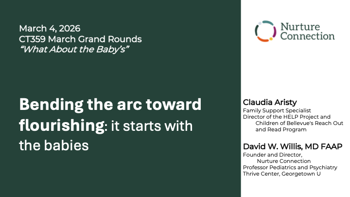 Beginning in pregnancy, early relational health is the foundation for the rest of a child's health, development, and wellbeing. Claudia Aristy, a family support specialist, will share what this feels like from a family's perspective and David W Willis, MD, a pediatrician, will share the science, the emergent system transformation in partnership with families, and the importance of getting this right from the start. This presentation is about focusing on the babies and the caregivers who love them, and their essential roles in building a life course of flourishing for all. Access the slides here.